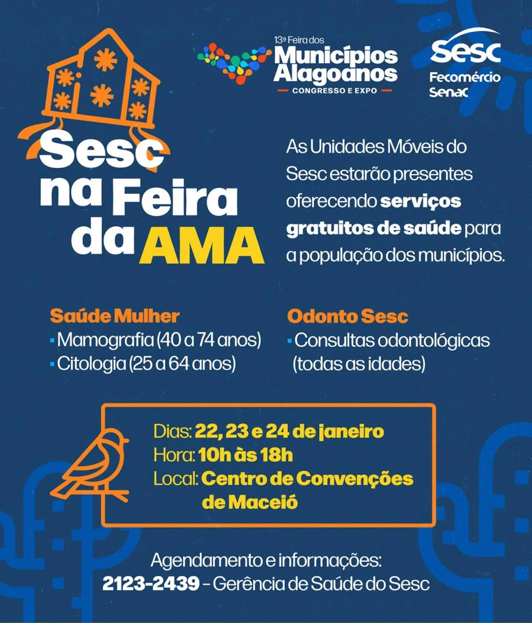 Para agendamentos e informações, entre em contato com a Gerência de Saúde do SESC pelo telefone (82) 2123-2439.