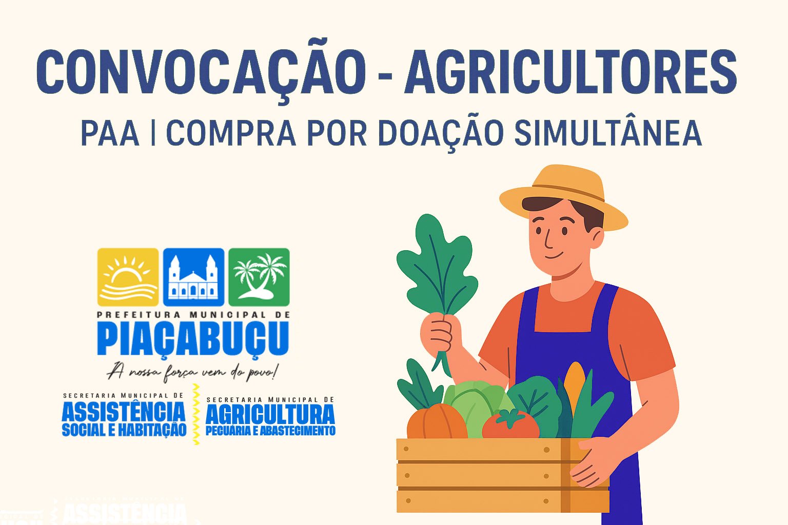 A Prefeitura Municipal de Piaçabuçu, por meio das Secretarias de Assistência Social e Agricultura, convoca agricultores familiares para participar do Programa de Aquisição de Alimentos (PAA) na modalidade Compra por Doação Simultânea.