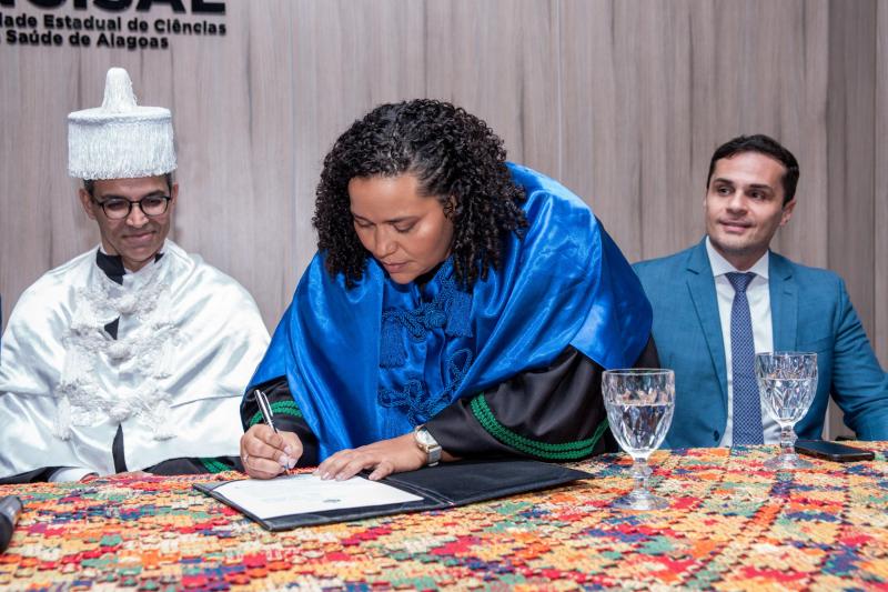 Durante a solenidade, a nova reitora recebeu formalmente os símbolos do cargo – a samarra, vestimenta tradicional associada aos reitores, e o capelo, que em sua cor branca representa a união do saber. Vitor Pereira, secretário de Estado de Governo, esteve presente e representou o governador Paulo Dantas, reforçando a importância da celebração. A cerimônia também contou com a presença de reitores de outras instituições de ensino superior de Alagoas, além do diretor-presidente da Fundação de Amparo à Pesquisa do Estado de Alagoas (Fapeal) e de diversos membros do Judiciário.